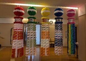 完成した七夕飾りは、校舎の昇降口に飾り、行きかう生徒たちの目を楽しませたそうです。