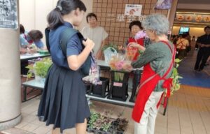 色とりどりの花が並びました。「わあ、きれい」「お母さんにおみやげ?」
